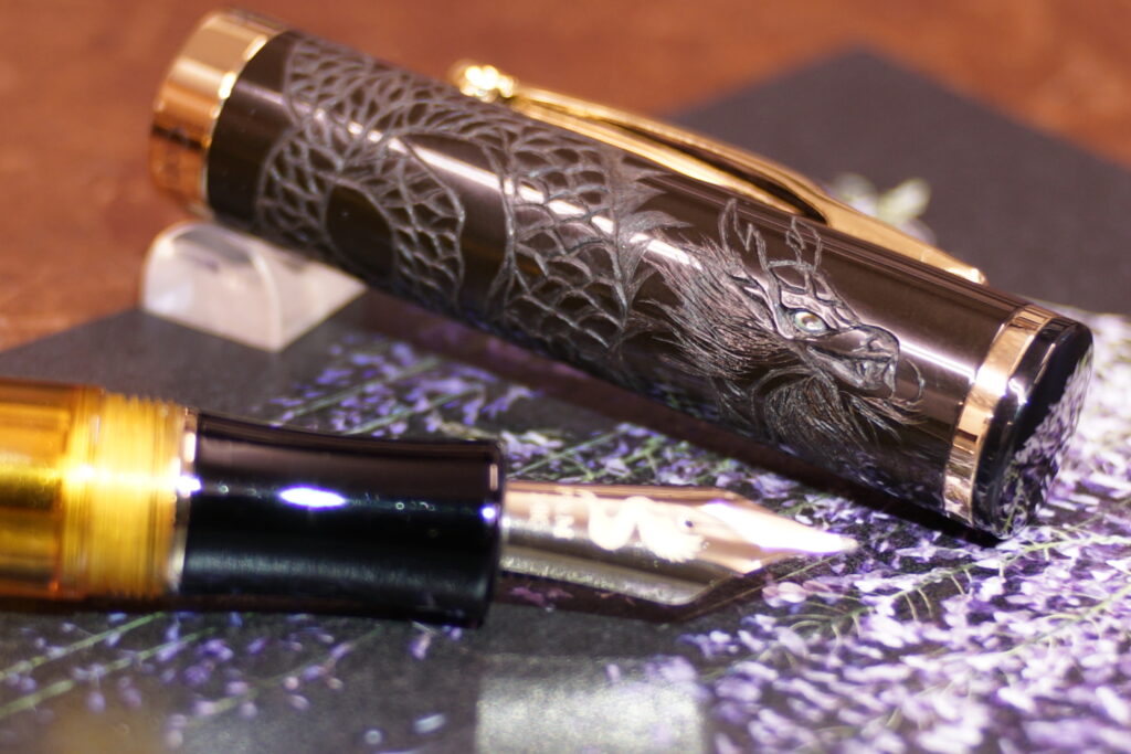 そうやって知り合った川本泰さんに作品をお願いして数ヶ月後、この怪しくも愛嬌を感じる龍の彫刻が入った万年筆が出来上がりました。