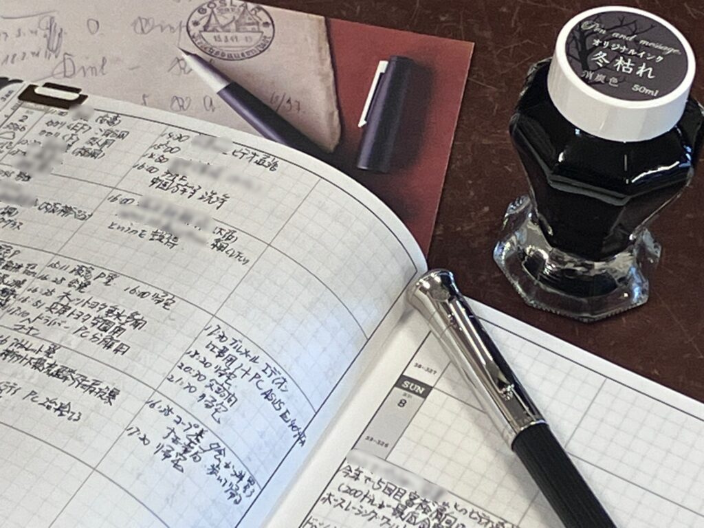 たとえば私の生活インクは、手帳には「オリジナルインク冬枯れ」や「パイロットブラック」という抑えた黒色、手紙などには「パイロットのブルー」、ドイツ系の万年筆に入れるモンブランやペリカンの「ブルーブラック」などを色とともに、特性も気にして選んでいます。